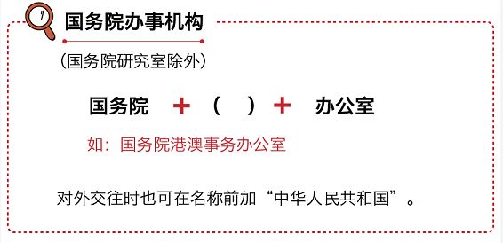 国务院办事机构,主要是协助国务院总理办理专门事项,不具有独立的行政管理职能。目前,国务院办事机构,除国务院研究室外,名称均是“国务院ⅩⅩ办公室”。对外交往时也可在名称前加“中华人民共和国”。