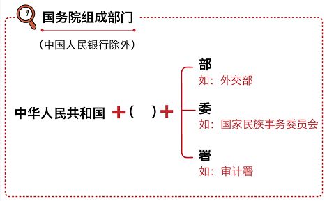 国务院组成部门的名称分别叫“部、委、行、署”,除中国人民银行外,开头都冠“中华人民共和国”。这里的“中华人民共和国”既是国别概念,也是区域概念。