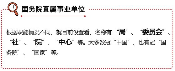 国务院直属事业单位,根据职能情况不同,就目前设置看,名称有“局”、“委员会”、“社”、“院”、“中心”等,大多数冠“中国”,也有冠“国务院”、“国家”等。