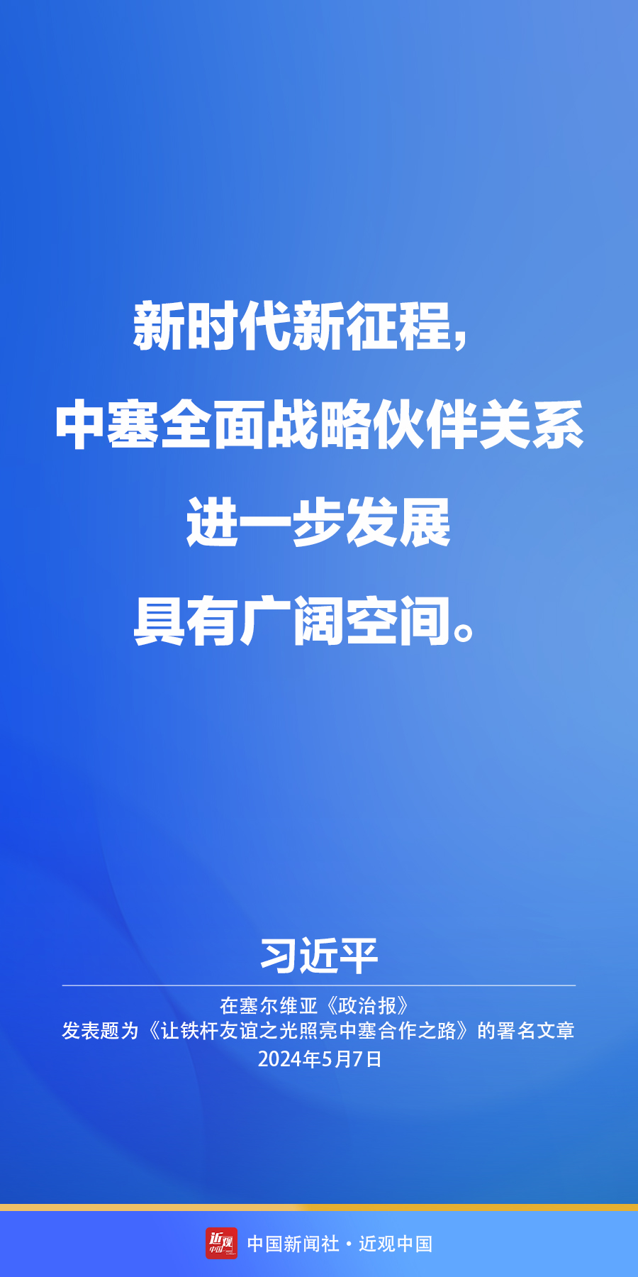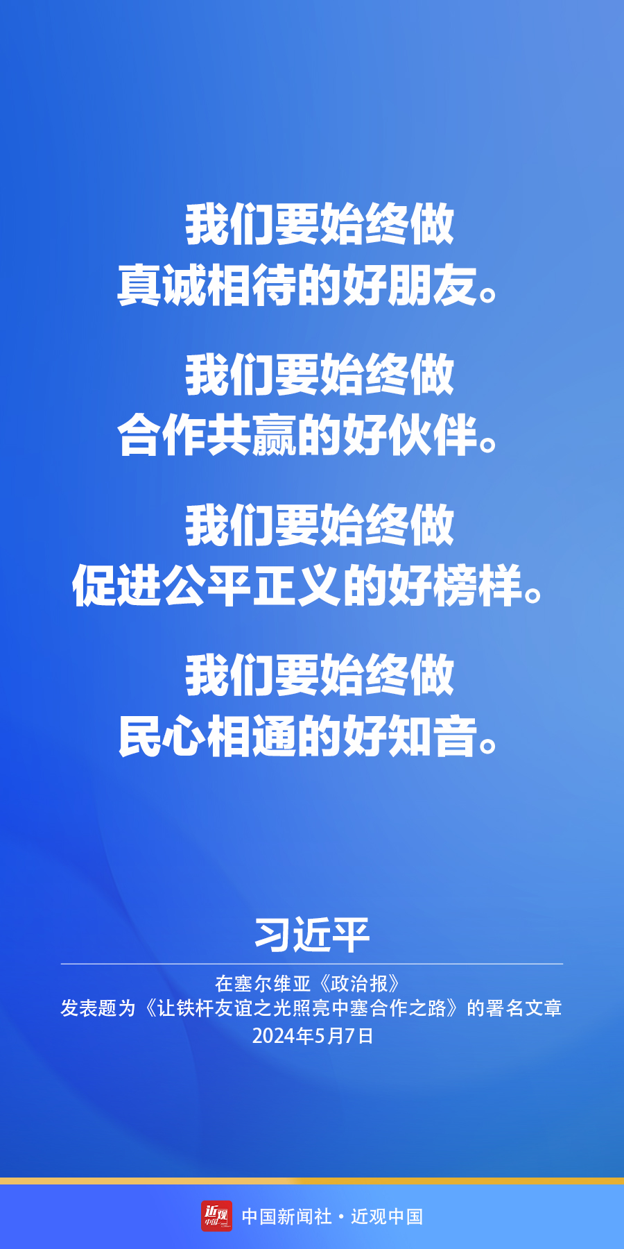 5月7日,在赴贝尔格莱德对塞尔维亚进行国事访问之际,国家主席习近平在塞尔维亚《政治报》发表题为《让铁杆友谊之光照亮中塞合作之路》的署名文章。习近平指出——